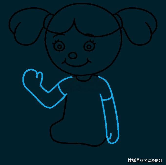 第五步:接著在身體畫出娃娃的手臂。在每個肩部擦掉一段,並延伸兩條短曲線以形成袖子。最後用一條額外的曲線將它們連接起來。然後,延伸另一組線以形成手臂。如圖所示: