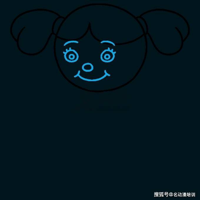 第三步:接著畫出布娃娃的臉。在每隻眼睛和鼻子畫一個圓圈。在每隻眼睛內畫一個較小的圓圈來表示瞳孔。在眼睛周圍畫短線作為睫毛,並在每條上方畫一條曲線以形成眉毛。畫一條寬的「U」形線形成微笑的嘴巴,並在角落處用短曲線完成它。如圖所示: