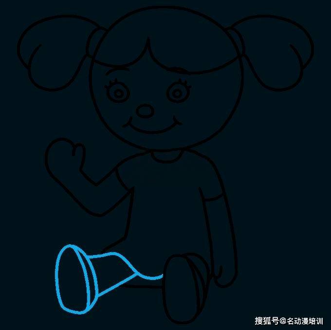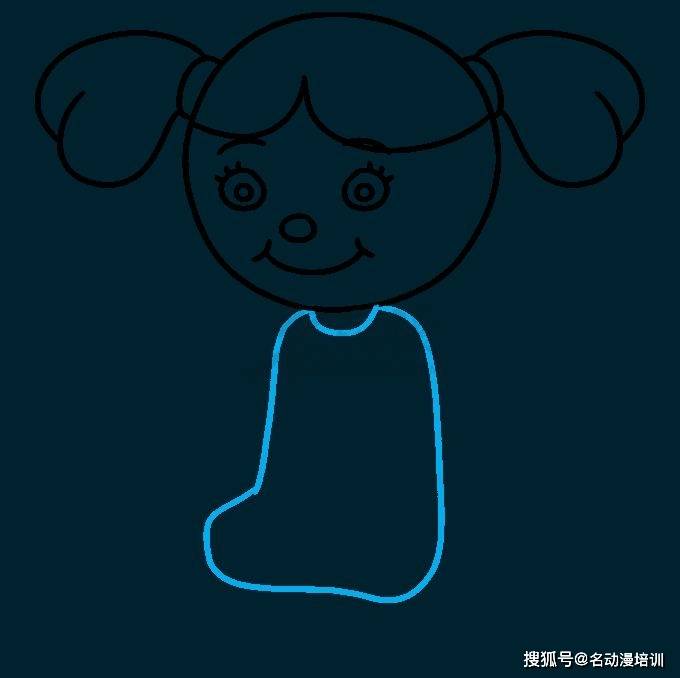 第四步:再從在頭部下方畫一條「U」形線以形成頸部。然後,延伸一條長而彎曲的線並將其對折起來,以包圍娃娃身體的不規則形狀。如圖所示: