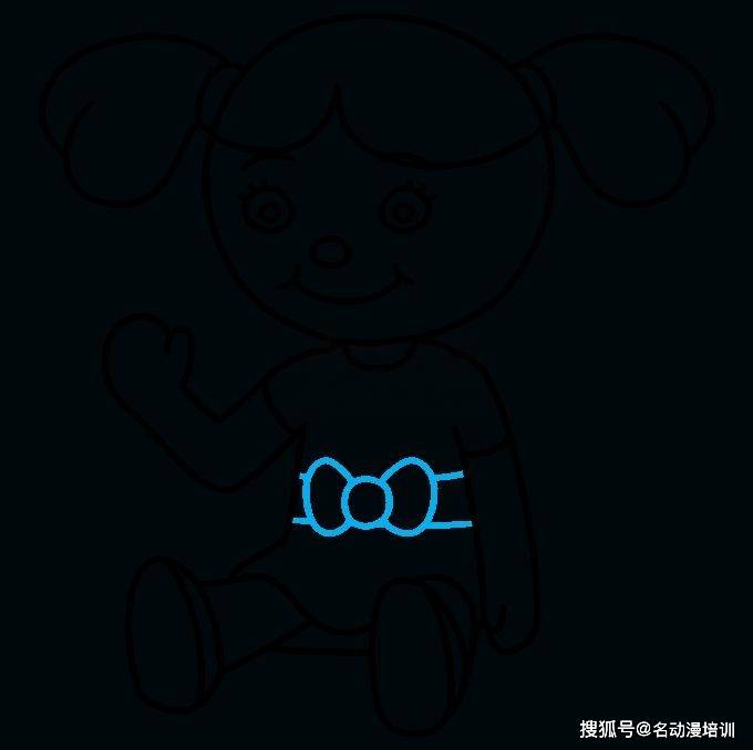 最後一步:最後在布娃娃身體的中心畫一個圓圈,並在它的每一側圍上圓形,形成一個蝴蝶結。從蝴蝶結的每一側到裙子的一側畫幾對線。如圖所示:
