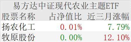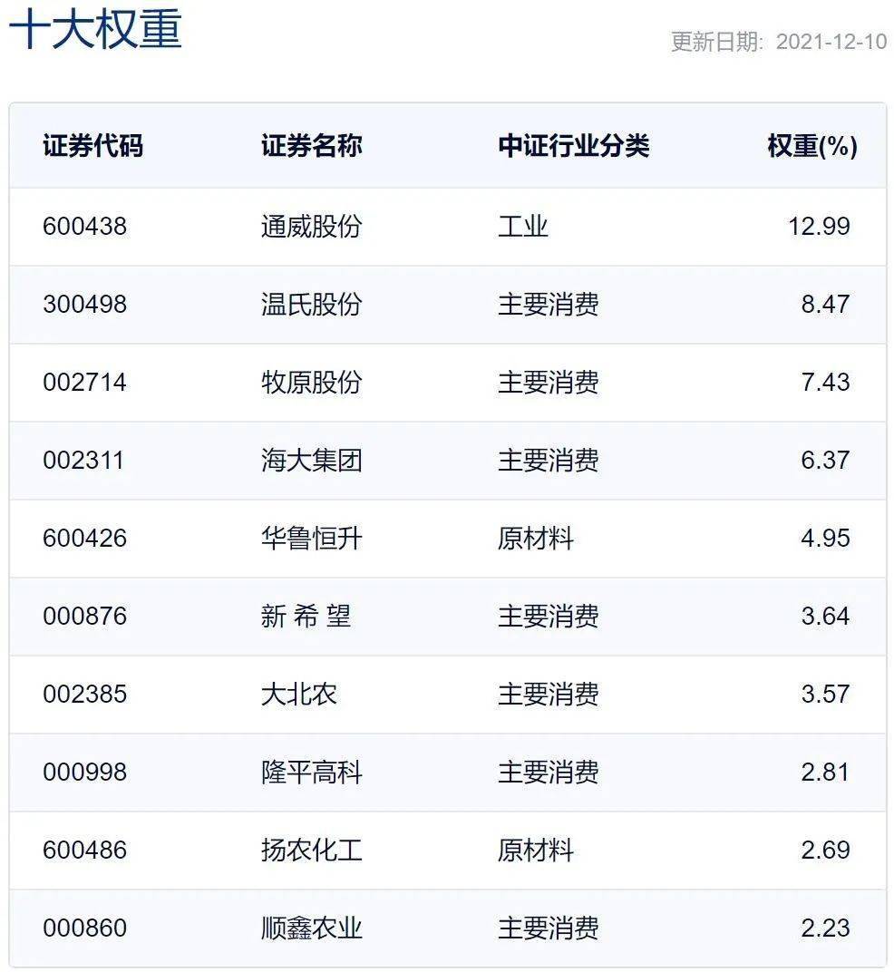 公開資料顯示,中證現代農業主題指數選取涉及農業用地流轉、農機、節水灌溉、農資服務、種子、養殖業,以及農業生產信息化、經營信息化、管理信息化、農業智能機械等業務的上市公司證券作為樣本,以反映現代農業類相關上市公司的整體表現,該指數前十大權重股分別是通威股份、溫氏股份和牧原股份。