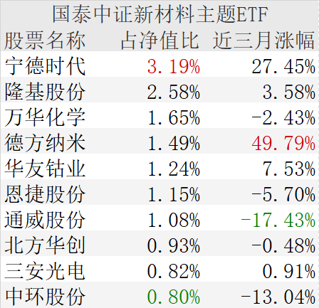 公告書顯示,截至2021年12月6日,前十大重倉股中,寧德時代、隆基股份占淨值比均超2.5%;從近三個月漲跌幅看,前十大重倉股德方納米、寧德時代分別上漲了49.79%和27.45%;而通威股份、中環股份則均跌超13%。
