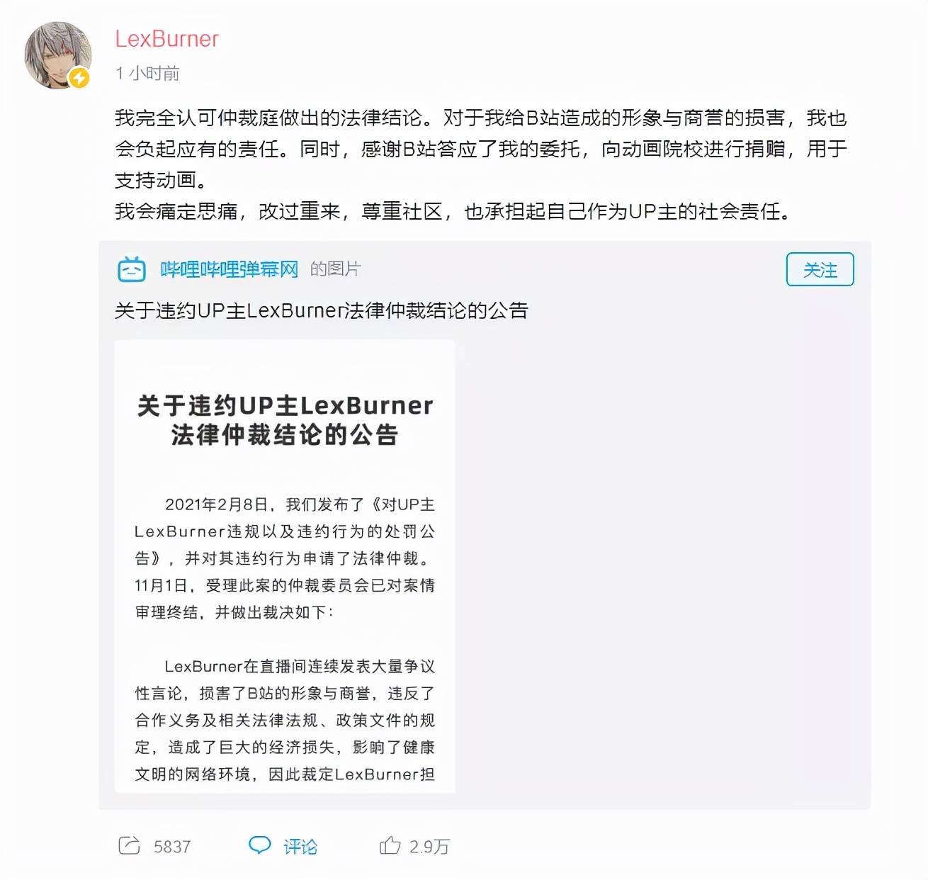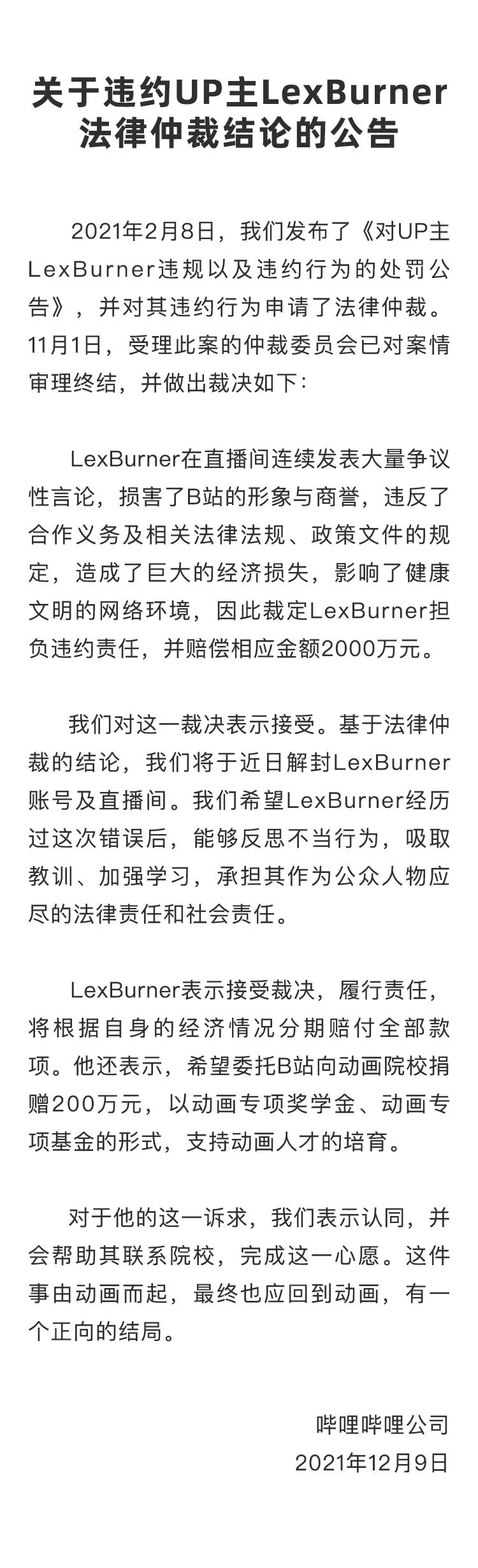 就在今天(12月9日)晚上,B站官方帳號發布了一則關於Lexburner法律仲裁結論的公告。