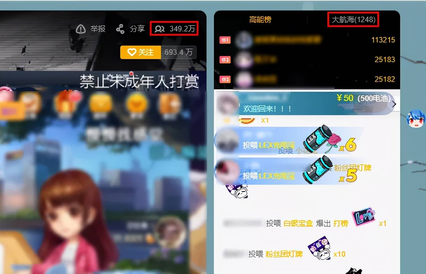 從晚上8點進入直播間開始,裡面不停地又是刷禮物,又是沖艦長。