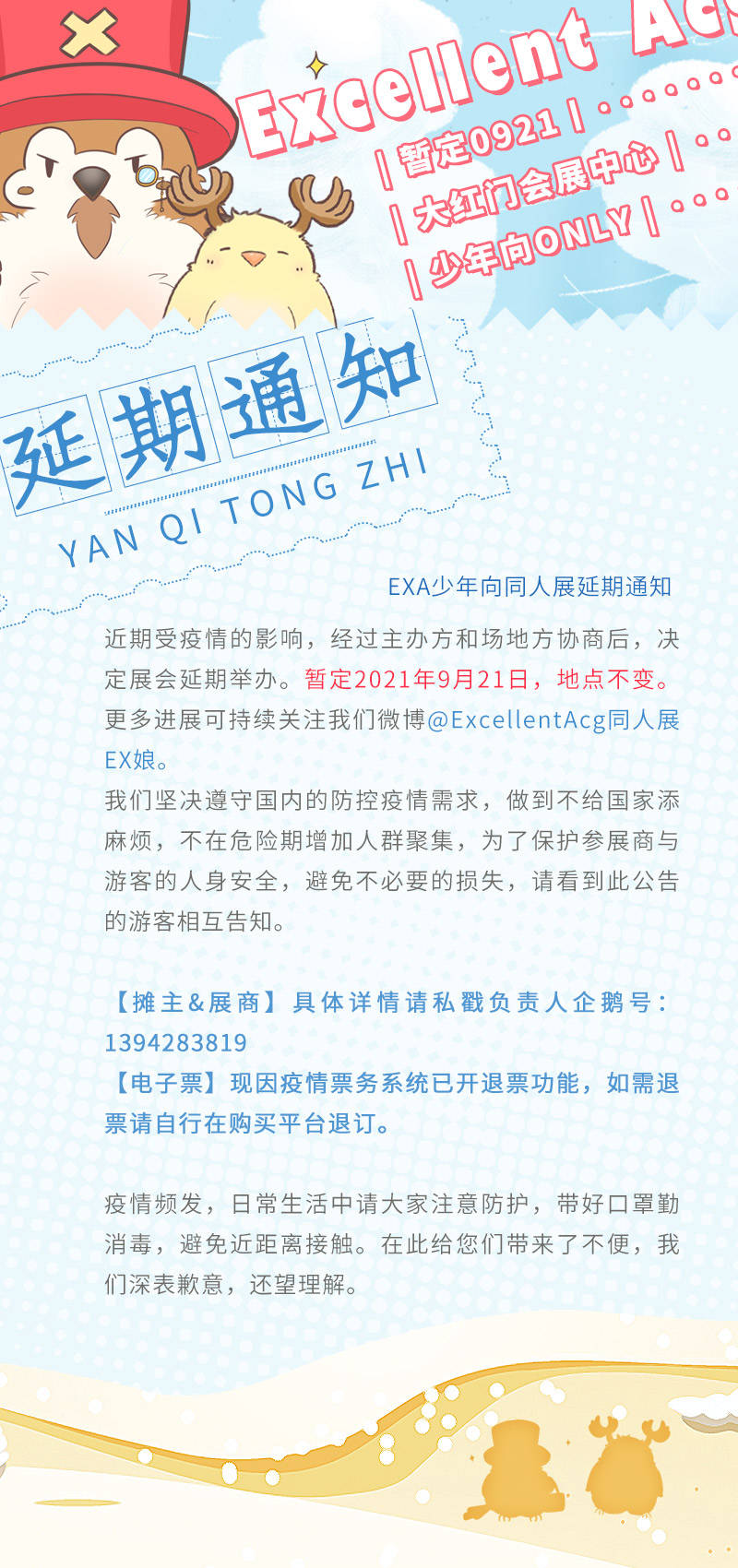 近期受疫情的影響,經過主辦方和場地方協商後,決定展會延期舉辦,暫定2021年9月21日,時間地點不變,更多進展可持續關注@ExcellentAcg同人展EX娘。