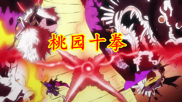 錦衛門、阿修羅童子、傳次郎和犬嵐擺出了御田的二刀流架勢,在凱多的不屑中,使出了「桃園十拳」,這是御田曾經將凱多從天斬落的招式,再一次斬中了同樣的位置,凱多都被砍的翻白眼了。