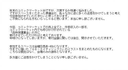 昨晚8點,洗蠟筆又發推宣布:很猶豫要不要出席年底的C99,但考慮到展會已經准備了空間的,避免給大家帶來麻煩,最後還是決定參展。這可能會令一些人不舒服,非常抱歉。這次C99中所有的銷售額和自己身為作家的部分收入,都將捐贈給在Comiket里呼籲的「森林保護募捐」,捐款金額將在日後公開。
