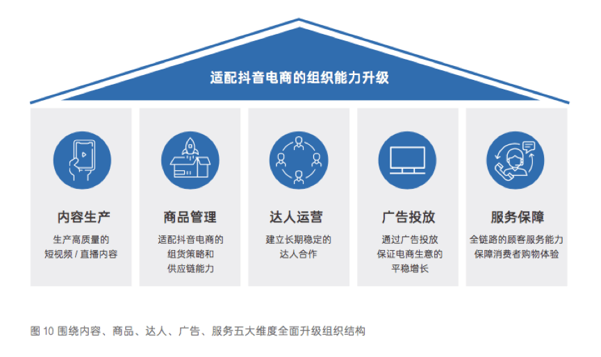 如果想做好興趣電商,《白皮書》建議商家從內容、商品、達人、廣告、服務這五個基礎項出發,適配出一個全新的抖音電商隊伍: