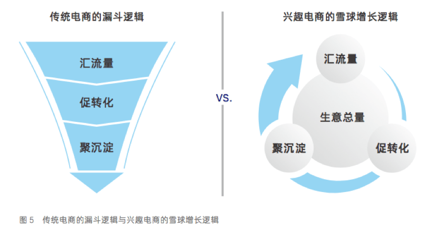 流量、轉化、沉澱是電商三個基本要素,但是在傳統電商模式下,這三要素是漏斗式逐級遞減;但在興趣電商邏輯下,由於短視頻和直播可以沉澱粉絲,流量、轉化、沉澱變成了滾雪球增長模式,免費流量和付費流量相互作用,新開播有免費流量扶持,轉化做得好,可以放大校準流量,這時再做付費流量,整體流量還可以通過各種數據工具做好用戶沉澱,成為下一次開播的基礎,這種滾雪球模式,是興趣電商特有的。