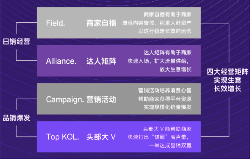其中,商家自播和達人矩陣是日常經營,細水長流;營銷活動頭部大V是集中爆發,既能做品牌,又能有銷量。