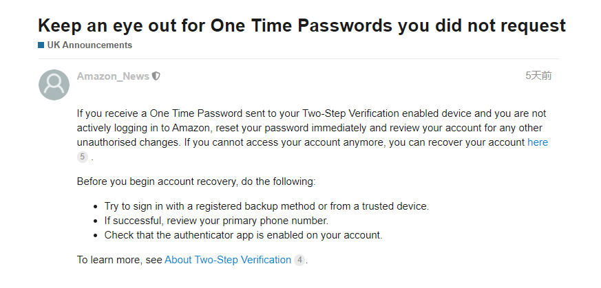 如果你收到發送到兩步驗證設備的一次性密碼,並且沒有主動登錄到亞馬遜,請立即重置密碼,查看你的帳戶是否有任何其他未經授權的更改。如果無法再訪問自己的帳戶,則可以採取措施恢復帳戶。
