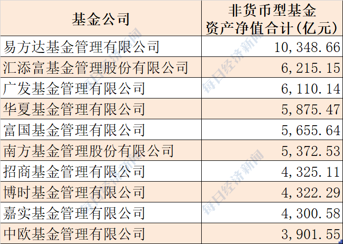 十家基金公司非貨基規模合計達5.6萬億元,其中易方達基金的非貨幣資產淨值合計突破萬億元,達10348.66億元,另外,匯添富基金和廣發基金非貨幣資產淨值合計超6000億元。