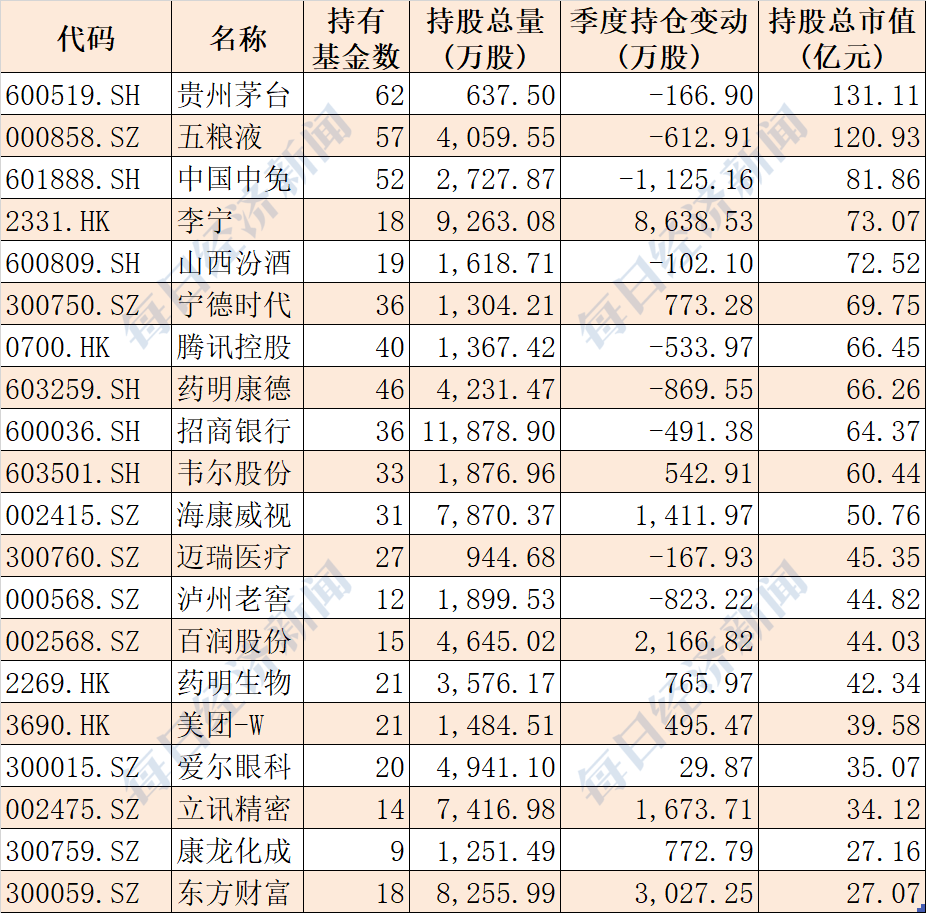 華夏基金重倉持有白酒、新能源車和金融相關個股,貴州茅台持股市值達182億元,且白酒股普遍獲得了加倉,另外還分別增持招商銀行和中國平安1046萬股和652萬股;而拋售較大的是立訊精密,減持了613萬股。