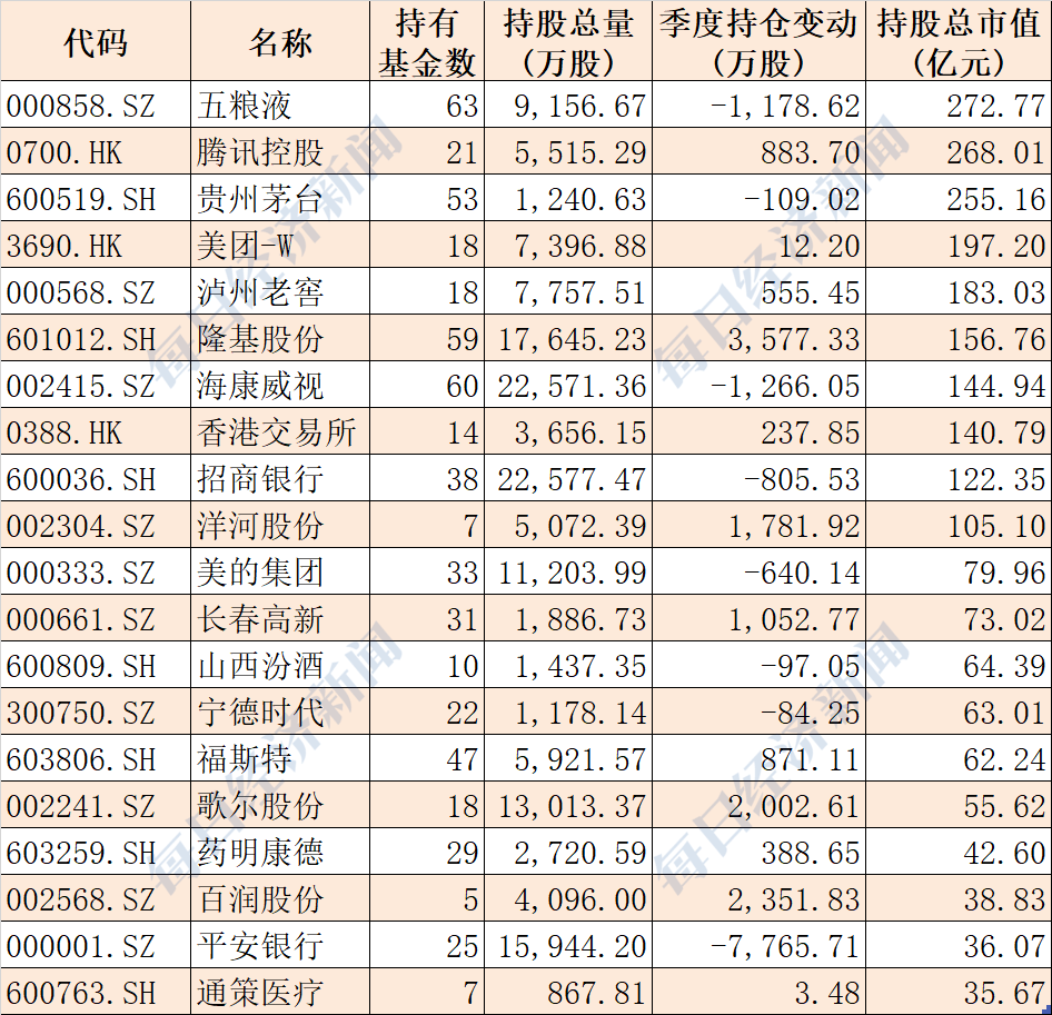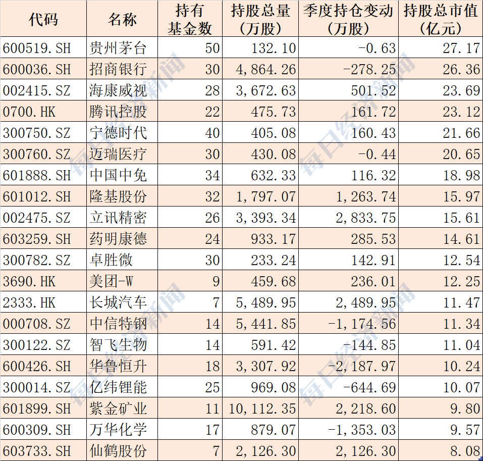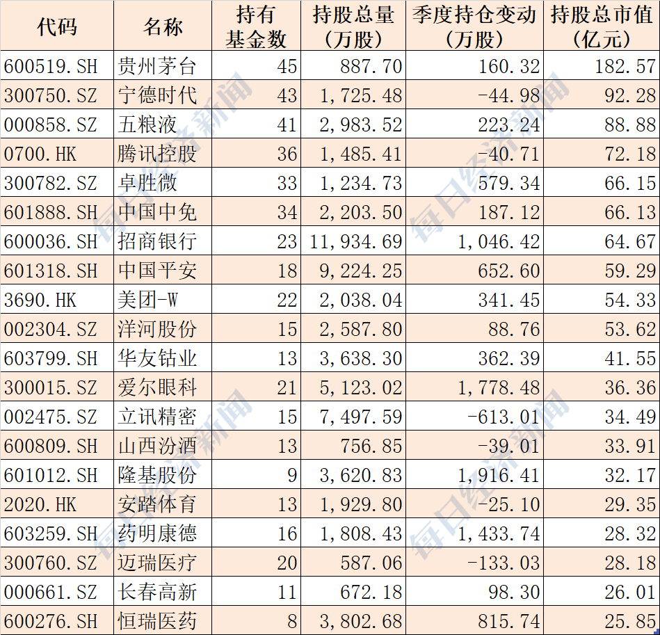 Wind數據顯示,截至7月21日,按持股總市值統計,全市場基金持倉的前十大重倉股分別為貴州茅台、寧德時代、五糧液、騰訊控股、海康威視、藥明康德、隆基股份、招商銀行、邁瑞醫療和瀘州老窖。