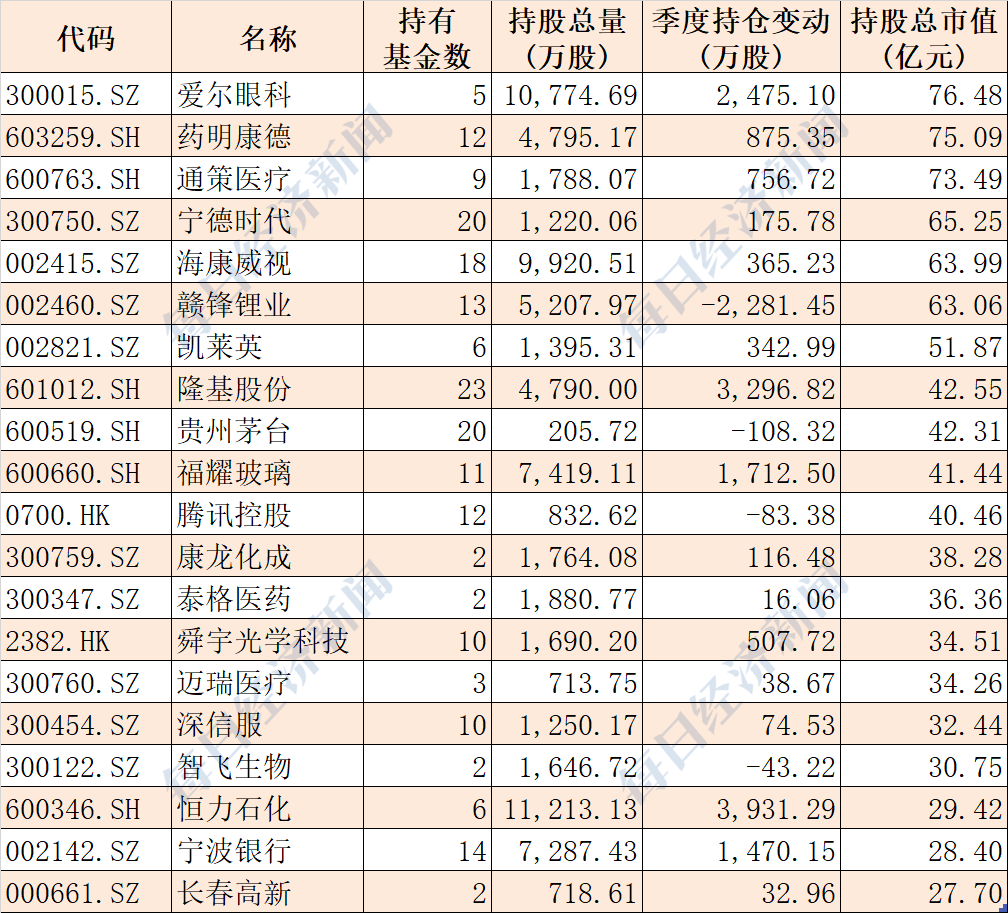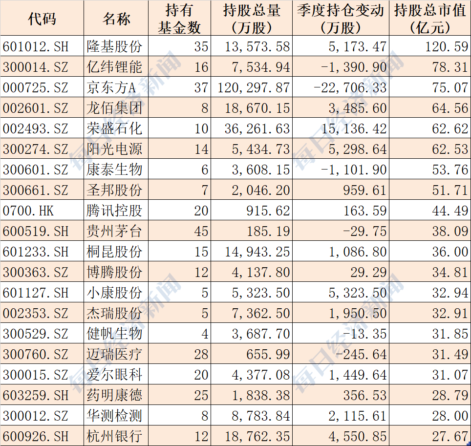 二季度,東方財富、榮盛石化和江蘇銀行獲得了基金逾3億股增持,此外,隆基股份、東方財富分別有930家、639家基金重倉持有。