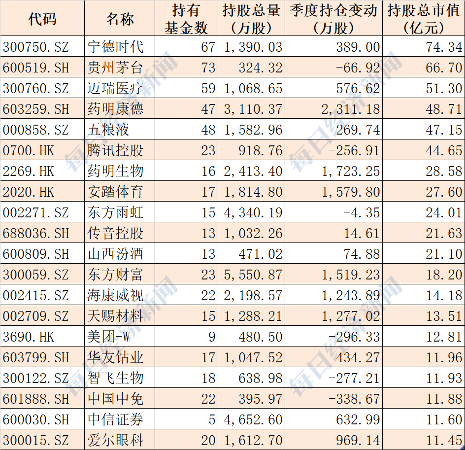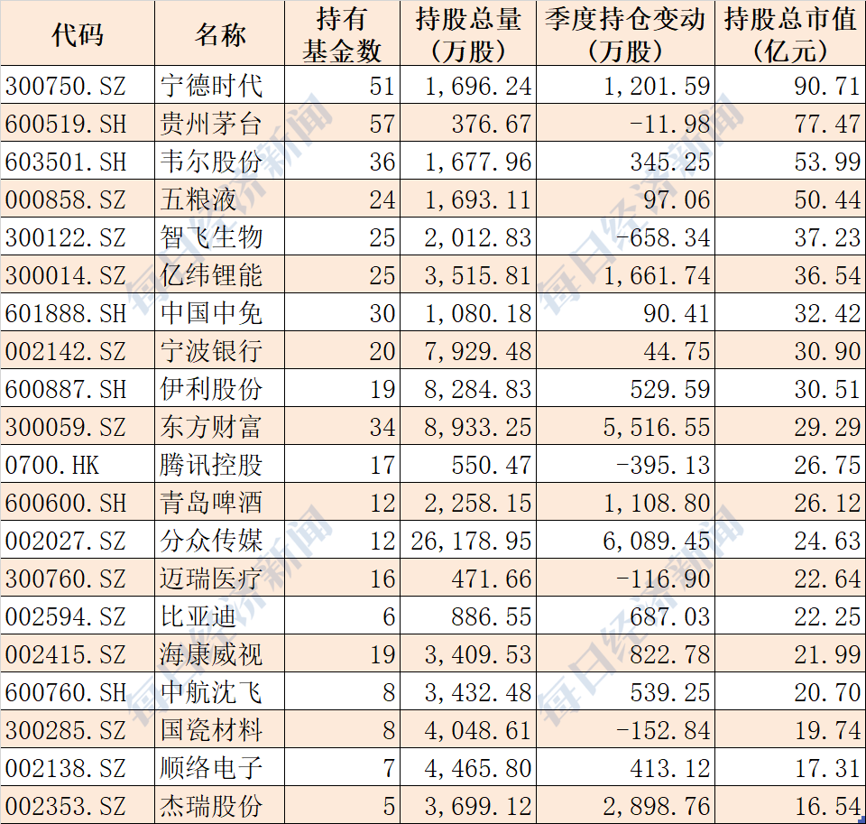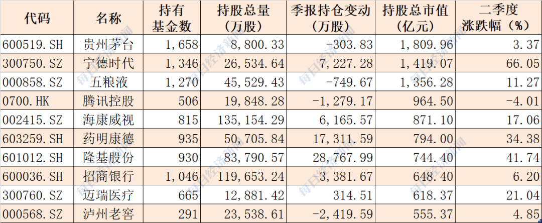 從前十大重倉股位次看,寧德時代上升最為明顯,從一季度基金第七大重倉股躍升至第二位,僅次於貴州茅台,其二季度被基金增持了7227萬股。