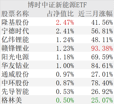 公告書顯示,截至2021年7月19日,前十大重倉股中,隆基股份、寧德時代占淨值比均超2%;從近三個月漲跌幅看,前十大重倉股集體上漲,其中贛鋒鋰業、華友鈷業和中環股份分別漲93.38%、84.61%和78.4%。