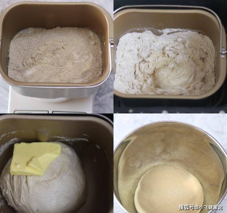 製作方法:1.首先把除了黃油所有的材料都放入麵包桶揉面 2.揉一遍再加入黃油揉一遍 3.揉好後就放在盆里,發酵至2.5倍大