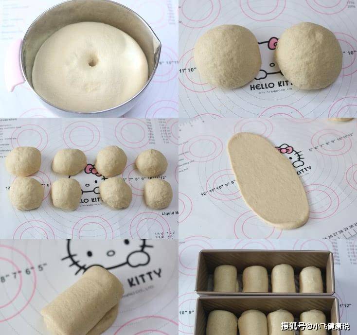 4.面團拿出來分成兩份靜置鬆弛十五分鍾 5.面團分成8份 6.取一個面團擀長,然後捲起來 7.繼續擀長捲起來 8.放入土司盒中