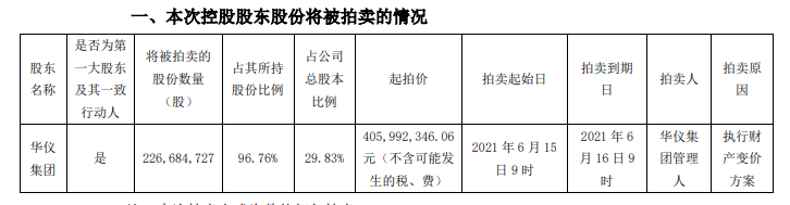 然而,這已經是第二次流拍了!根據公告顯示,第一次是在6月4日、5日,控股股東華儀集團持有的226,684,727股股份起拍價為451,102,606.73元,每股作價1.99元/股,結果首輪拍賣流拍。