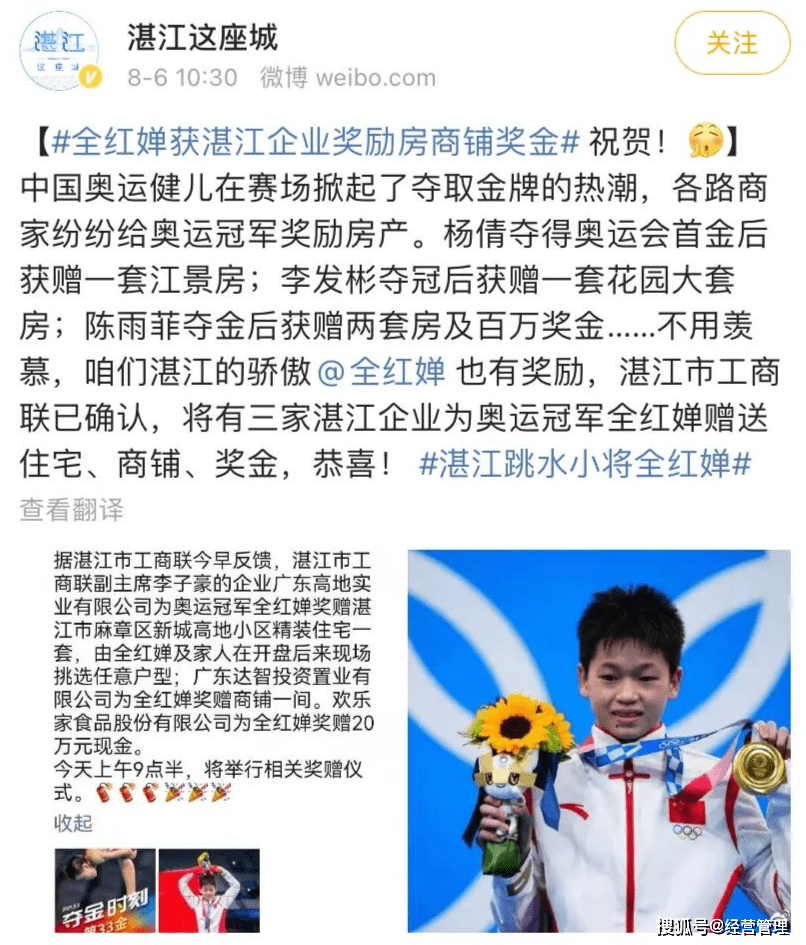 某企業直接自發獎勵全紅嬋20萬元現金,但是被她父親婉拒了,只肯收下鮮花。