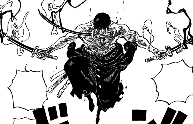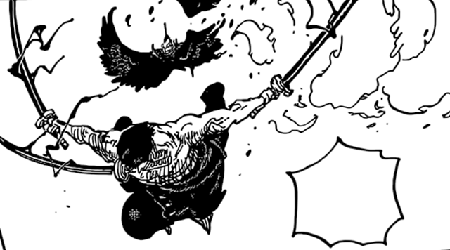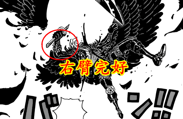 當放大索隆打敗燼的部分,會發現,燼好像右手斷了。燼和奎因是凱多的左膀右臂,考慮到奎因斷了左手,燼看來是真的斷了右臂。但隨著漫畫1036話曝光,燼的右臂其實並沒有斷,斷的是翅膀和刀。