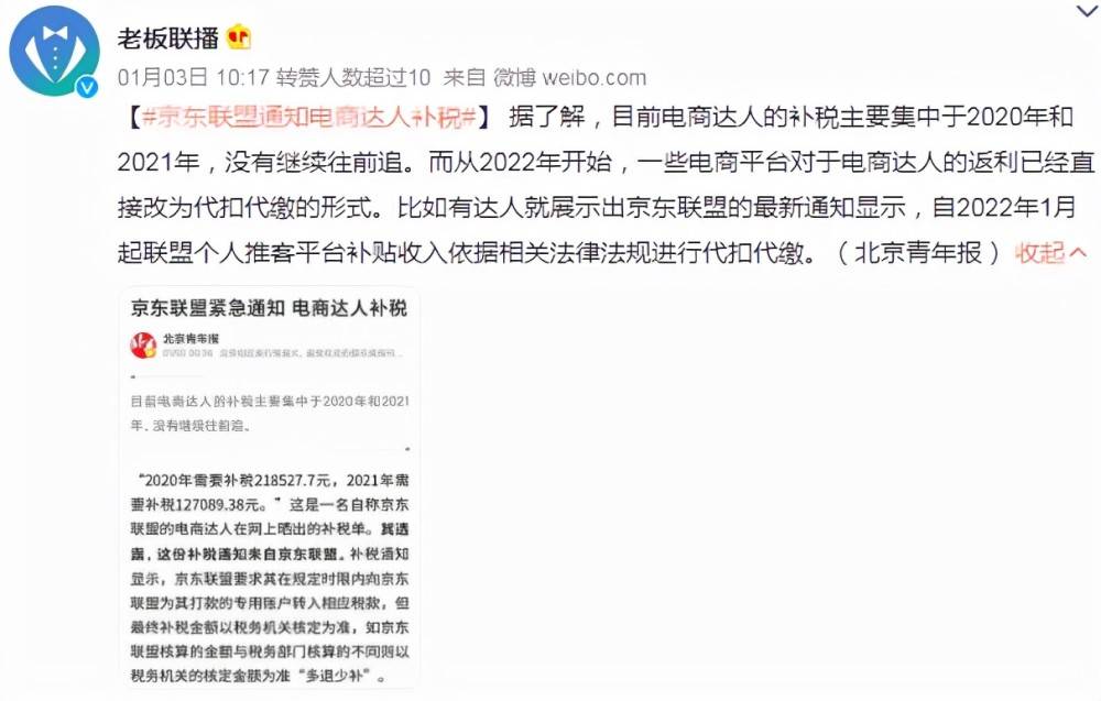 根據消息顯示,京東聯盟要求電商達人進行補稅,補稅的時間集中在2020年和2021年期間。並且從2022年1月開始,京東聯盟對個人推客在平台的補貼收入進行代扣代繳。除此之外,一些電商平台對電商達人的返利也被改成對稅務的代扣代繳。