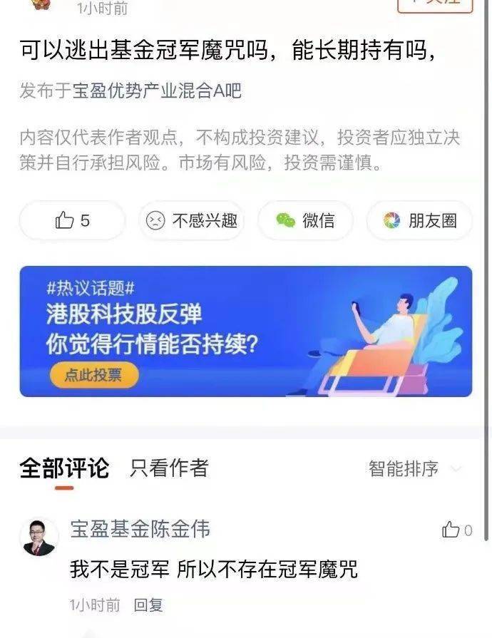 此外,記者注意到,今日在第三方交流平台上,在去年排名第三的寶盈優勢產業的評論區,有投資者問道,「可以逃出基金冠軍魔咒嗎?能長期持有嗎?」基金經理陳金偉在下方回復道:「我不是冠軍,不存在冠軍魔咒。」