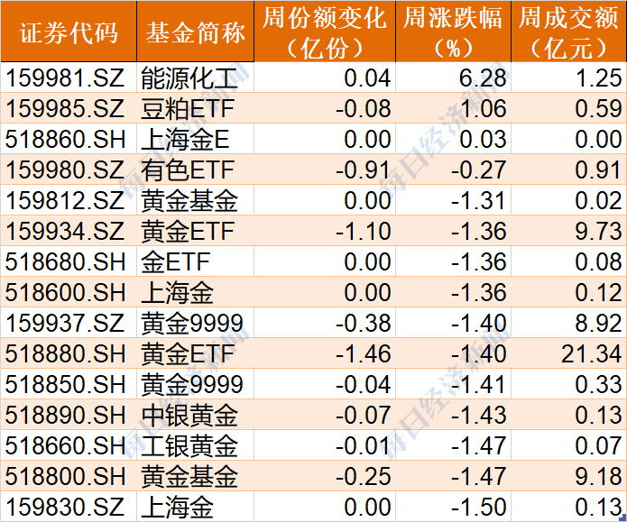 商品ETF本周漲跌互現,能源化工和豆粕ETF分別大漲了6.28%和1.06%,而黃金相關ETF則普遍跌超1%;份額上,有2隻黃金相關ETF減少了逾1億份。
