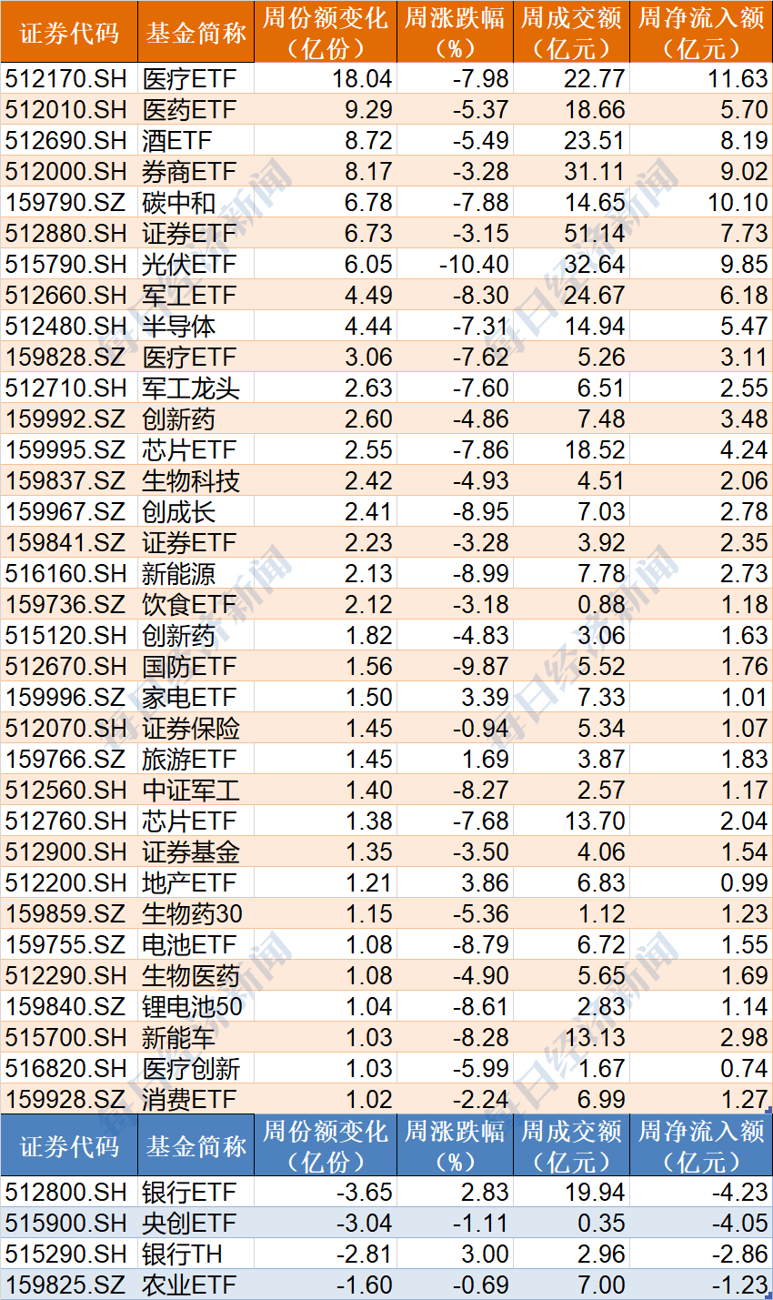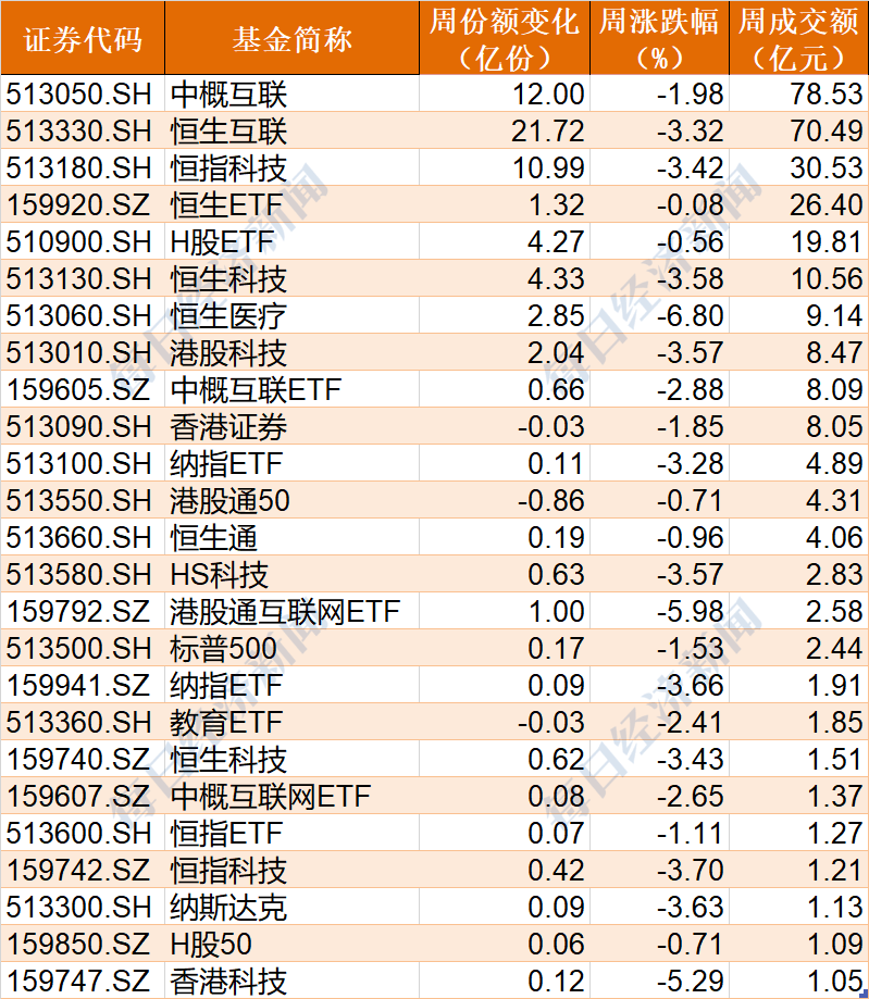 跨境ETF本周成交額超過1億元的有25隻,均出現了下跌;份額上,恆生互聯、中概互聯和恆指科技份額分別增加了21.72億份、12億份和10.99億份,份額均創出新高。