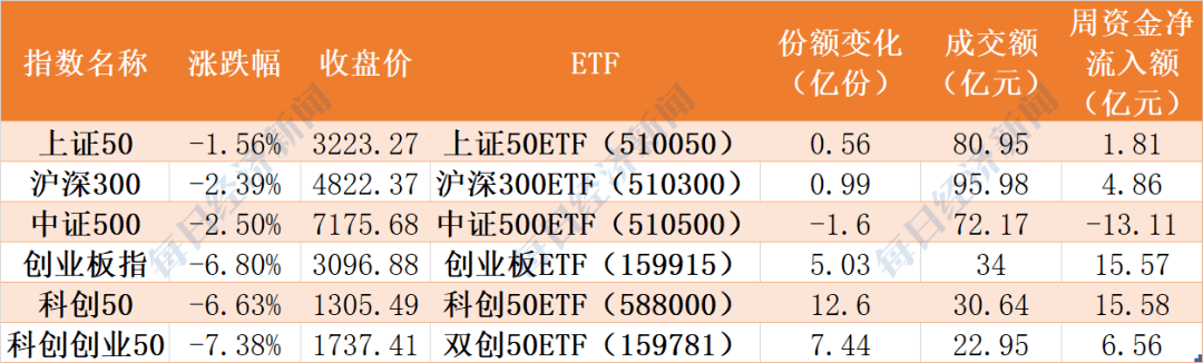 整體看來,2022年第一周,市場出現調整,引發資金進場抄底,以區間成交均價計算,6隻指數ETF本周合計淨流入約31億元,其中科創50ETF和創業板ETF分別淨流入資金15.58億元和15.57億元,而中證500ETF則淨流出13.11億元。