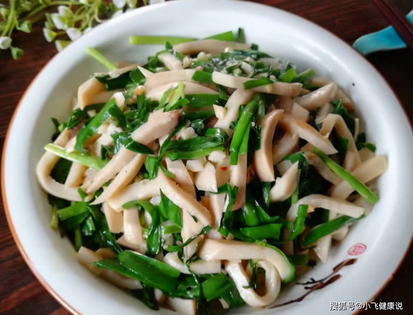 韭菜與杏鮑菇搭配味道很香更鮮,韭菜是民間的清腸菜,富含許多的植物纖維物質,是排毒的重要物質,有助於刮油清腸排宿便,而且女性吃了以後皮膚很好,孩子吃了以後腦瓜變得聰明,因為杏鮑菇補腦效果相當出色。