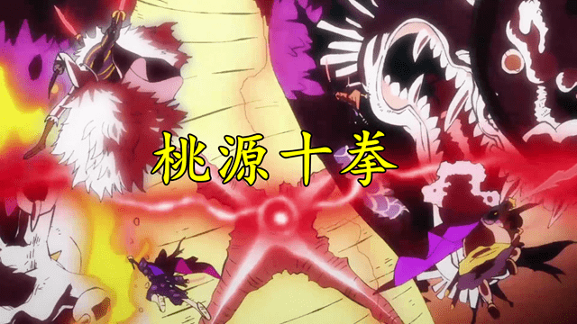 赤鞘武士臥薪嘗膽、忍辱負重20年,終於到了和凱多了解的時刻了。赤鞘武士VS青龍凱多,強大的武士大招亂發,幾乎每人都能打傷凱多。最終,四位雙刀流的赤鞘武士,以御田親傳的二刀流「桃源十拳」發出了終極一擊。