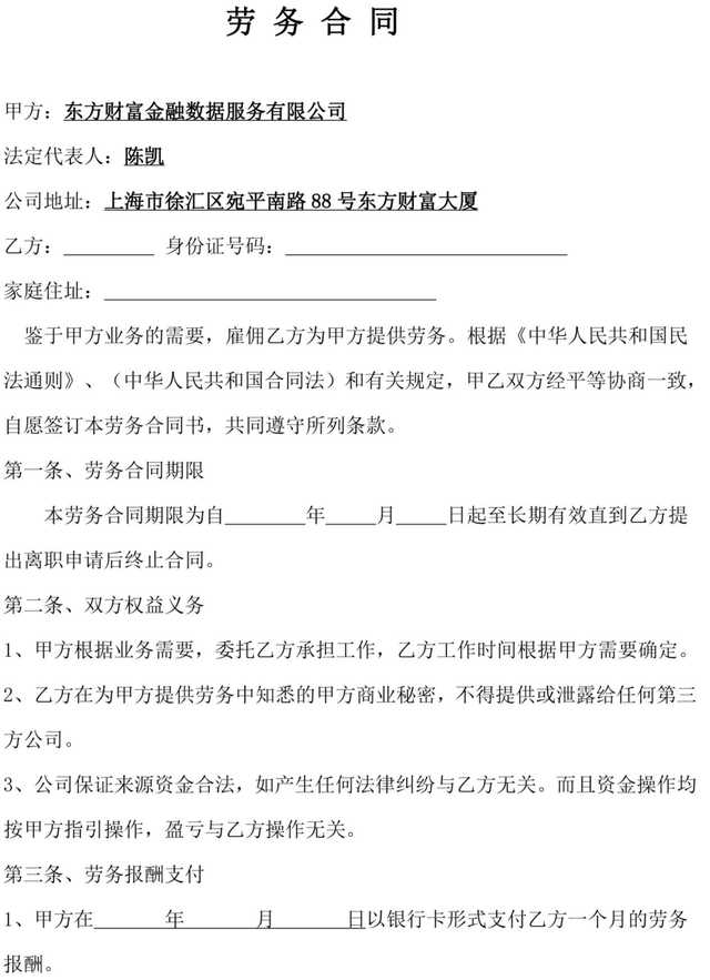 對方自稱是東方財富金融數據服務有限公司,現在招聘交易員,主要從事外匯交易,工作不難,跟著指令操作就行。
