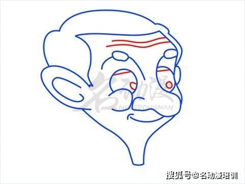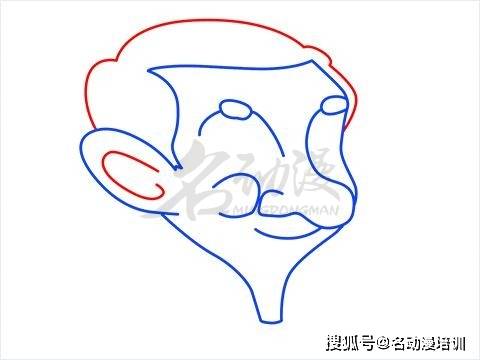 要點六:面部基本刻畫完畢之後我們可以開始畫出憨豆先生的頭發啦,從枕骨處開始拉出一條曲線,然後根據發絲的走向畫出頭發,直到完善整個頭部,最後開始刻畫耳朵的內屏。