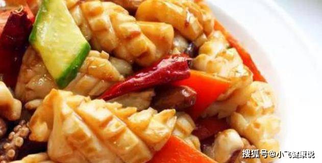 3. 不粘鍋放油,小火煸香乾辣椒,放入蒜姜略炒,放入胡蘿卜略炒,放入魷魚,和料汁,大火快速翻炒幾下,放入黃瓜和花生,炒幾下收汁即可