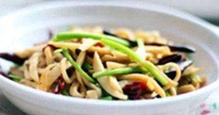 7、起鍋熱油,把干紅椒炒香,下豆腐絲煸炒片刻。
