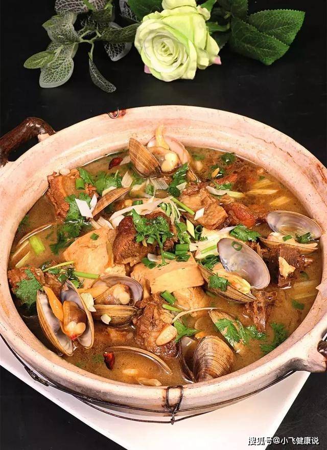 3.將豆腐片放入鹵湯中繼續鹵制20分鍾即可。砂鍋底部墊黃豆芽300克,擺上10片豆腐,再放8塊排骨,添鹵湯400克,上火加蓋煨10分鍾,添洗淨的肥蛤12個繼續燒1分鍾至開口,撒蔥花、香菜各5克,淋少許香油即可上桌。