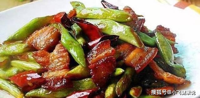 3. 起鍋燒油,油熱後,放入五花肉煎至表面金黃後,放入五香粉翻炒均勻,接著翻入干辣椒、蔥段、蒜末和姜絲煸炒出香味,倒入四季豆開大火翻炒,接著烹入料酒、生抽、耗油、味精,翻炒均勻,出鍋前倒入勾兌好的澱粉,出鍋裝盤即可。