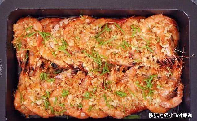 2、大蒜炒香,多放點鹽,出鍋備用。烤盤刷油,把蝦子碼好。