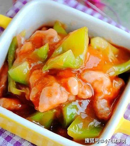 材料:豬肉300g、青椒50g、油適量、鹽適量、干澱粉適量、糖適量、番茄醬適量、水澱粉適量、味精適量