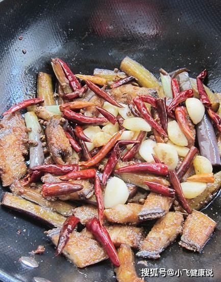 8.茄子浸泡後用水沖洗,瀝干水分。鍋內熱油,入茄段炸制變軟撈出瀝油,鍋內留少許油,小火煸香乾辣椒、花椒撈出備用