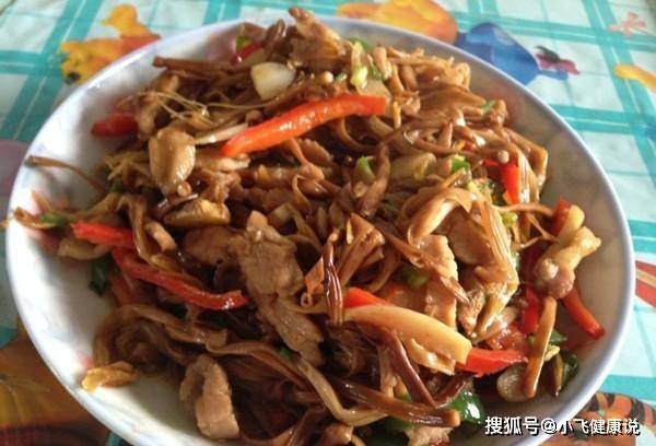 材料:干黃花菜適量200克、瘦豬肉絲適量50克、蔥適量、姜適量、小辣椒適量、花椒粉1/2小匙、鹽1小匙、生抽2大匙、老抽1/2匙、清湯1小碗;