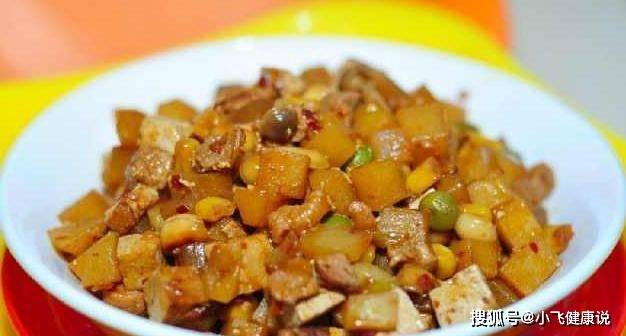 2、鍋入油燒熱,入蔥末、薑末、辣椒醬炒香,放料酒、鹽、白糖,入毛豆仁、熟肚丁、西芹塊、香菇干、豬裡脊丁、竹筍丁、香乾丁炒勻,水澱粉勾芡,放花生仁炒勻即可。