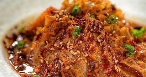 4、倒入油潑辣椒油,放入牛百葉小火煮一個半小時,煮至熟軟筷子能插入,關火浸泡半小時,涼透後切斜片。