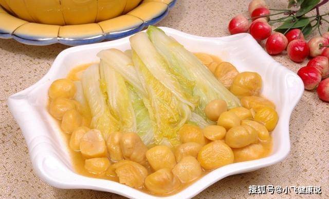 材料:白菜4片、板栗200克、蔥一段、姜1片、料酒20克、白糖5克、食鹽2克、澱粉5克、高湯半小碗、豬油1勺、香油1小勺