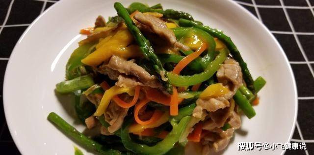 3、鍋中倒底油,肉絲下鍋滑熟盛出,鍋中留少許底油,放入青椒、胡蘿卜、蘆筍翻炒倒料酒、生抽,然後下入豬肉絲,加鹽、雞精、耗油白糖繼續翻炒,最後出鍋前放入芒果。