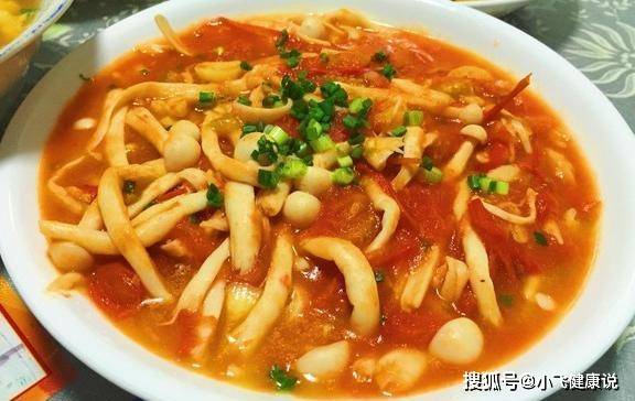 材料:西紅柿兩個、海鮮菇若干、小蔥兩根、蒜頭兩瓣、油、鹽、糖