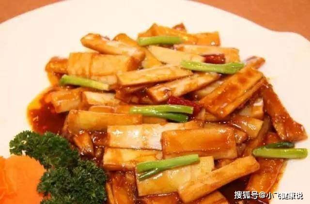 2、用清水將鮮筍尖洗干淨,一破兩開,放入開水鍋中氽一遍撈出。坐鍋,注入15克雞油,下入筍尖煸炒一下,隨即注入300克清湯,加入精鹽、料酒各少許,再放入發好的干貝,用微火煮5分鍾左右,撈出,控淨水;將干貝(不要弄散)平碼在圓盤四周,將竹筍整齊地碼在中央;