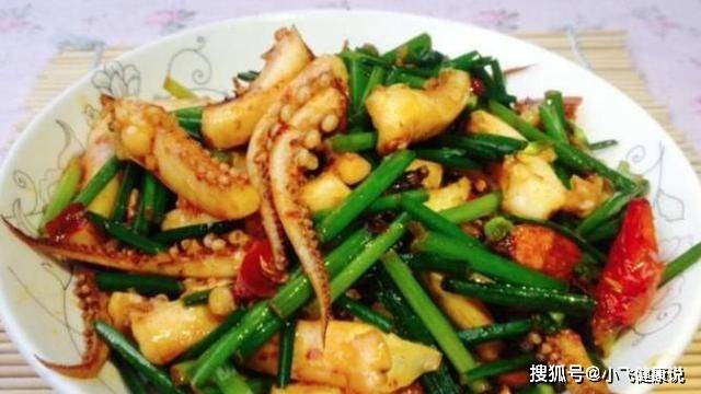 3.韭菜苔洗淨,切成3厘米的小段,焯水後的魷魚絲用清水沖洗干淨,切成3厘米的小段。